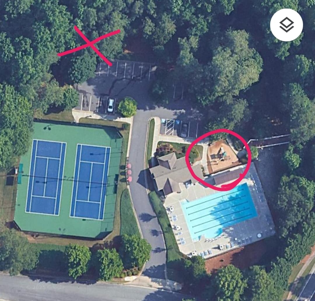 Physical distance is also something to consider. This is a neighborhood where the playground is circled in red, but at the X there are a set of swings. Those are separated by an entire parking lot, so they are separate wayspots.
