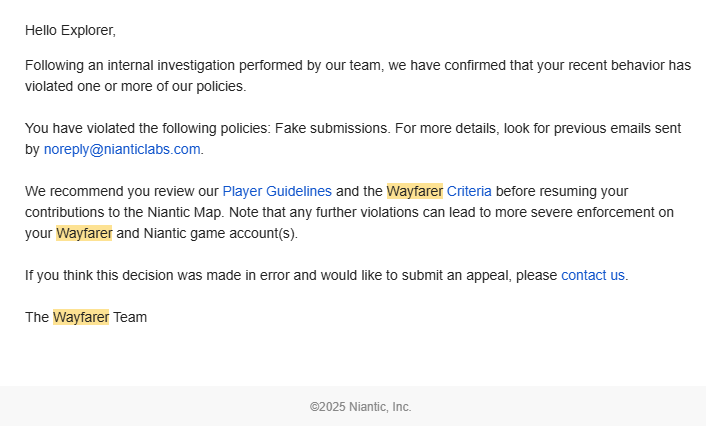 If I’m reading this correctly (Wayfarer Abuse Enforcement Ladder Policy — Wayfarer Help Center) I can be banned here and in game. I don’t want that to happen. Which is why I created a post.