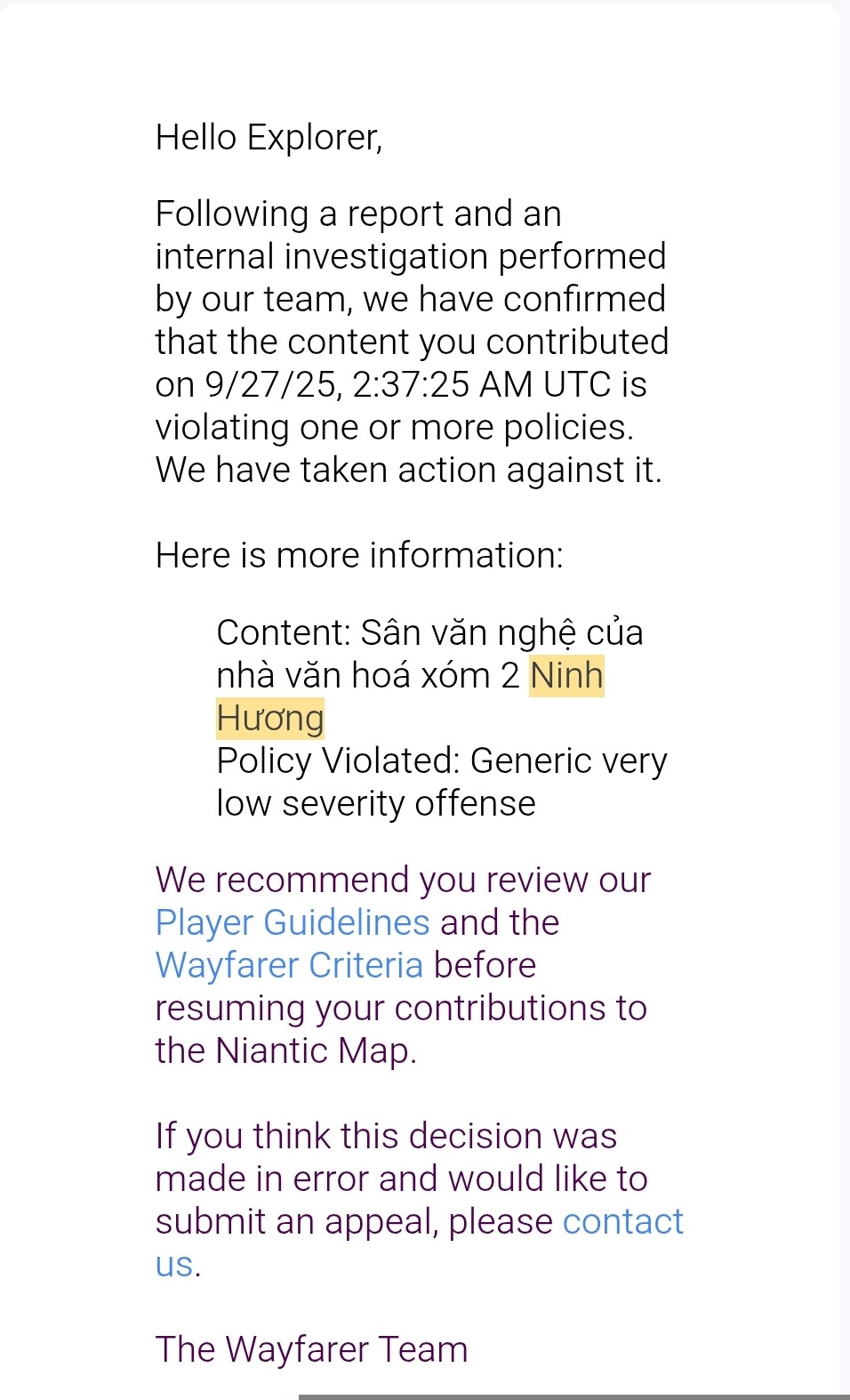 Hello everyone. Recently, I submitted four Wayspots around the Ninh Hương Community Center. Two of them were accepted, but the other two were unfortunately rejected — and those rejections led to my account being suspended for 30 days. I’m writing now to provide evidence that my two rejected submissions, “Sân văn nghệ của nhà văn hoá xóm 2 Ninh Hương” (the performance stage, located at 21.524044, 105.887147) and “Sân bóng chuyền của xóm 2 Ninh Hương” (the volleyball court, located at 21.524051, 105.886955), are absolutely genuine and not fake in any way.