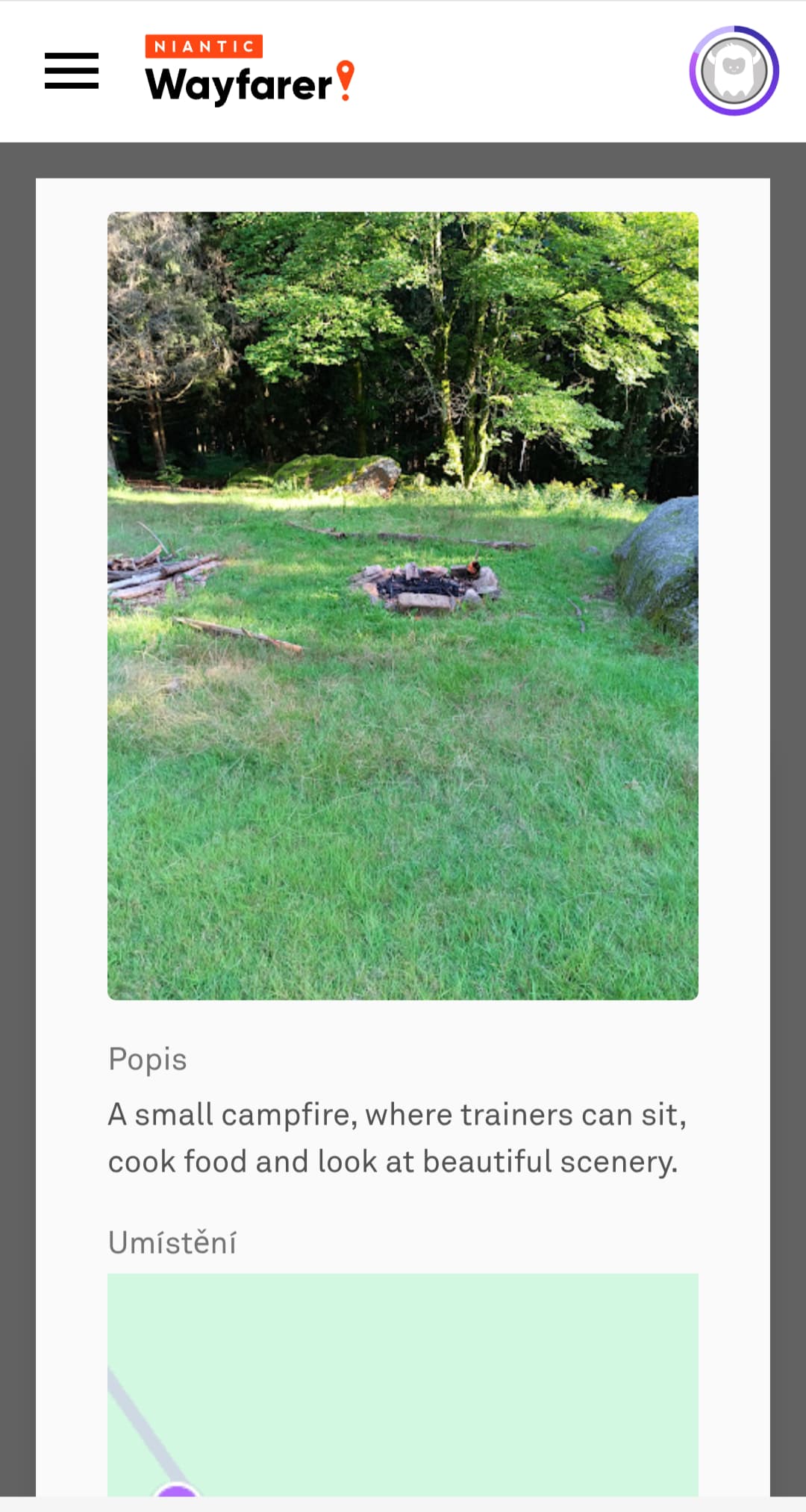 The key issue with the description is that “A small campfire, where trainers can sit, cook food and look at beautiful scenery” should be “A small campfire, where people can sit, cook food and look at beautiful scenery”.