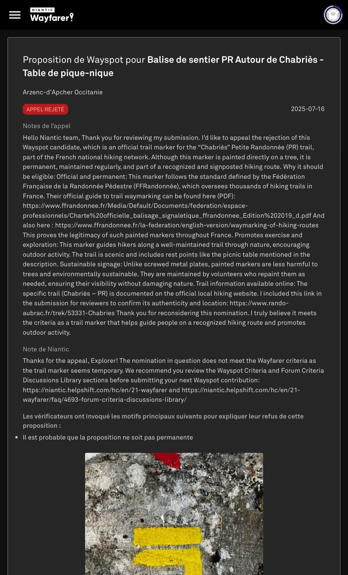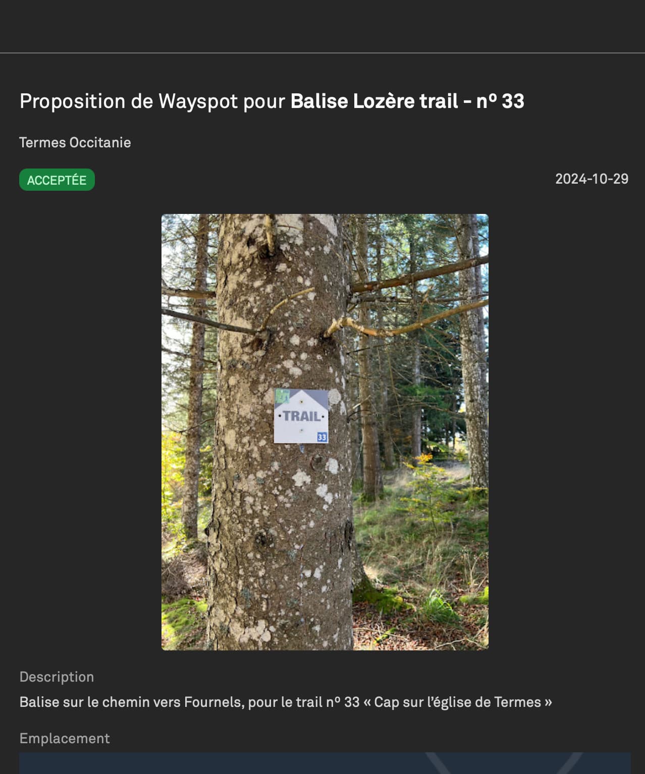 And also I even linked a url representing the trail path in the first submission I shown to help validators to check if the location of the Wayspot was indeed on a trail route (because there is no Street View there) : Chabriès - Rando Aubrac