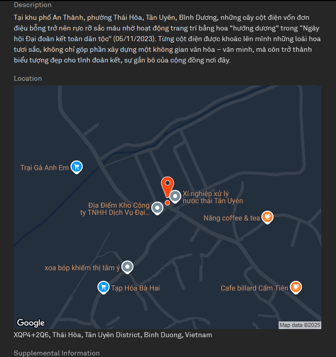 The supporting photo and information: This is a volunteer project to decorate the neighborhood, bringing a high level of exploration and social interaction. At the same time, it is a utility pole that has been permanently painted with different types of flowers, each with its own unique color. The decoration activity was carried out during the “National Unity Day” on November 5, 2023. Reference website: https://tanuyen.binhduong.gov.vn/tin-tuc/soi-noi-ngay-hoi-dai-doan-ket-toan-dan-toc-khu-pho-an-thanh-phuong-thai-hoa