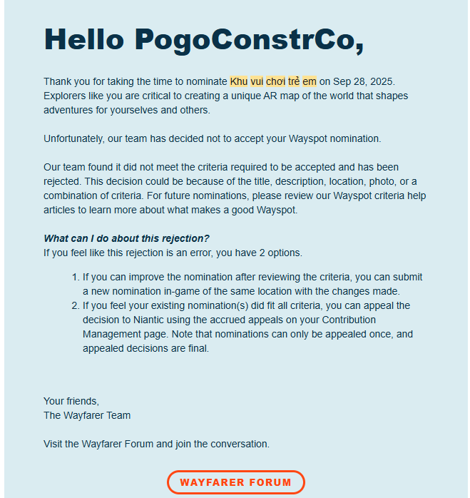 I got 30 days ban for fake nomination, despite that wayspot is completely exist. At first, I got rejected by Niantic staff, and the reasons of rejection is related to the title.