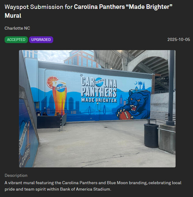I agree with @DTrain2002, stadiums in the US can be a little crazy with the decorations and such. Aside from the stadium itself. You can find really cool Points of interest inside the stadium. Here is an example of one I recently got approved inside Bank of America Stadium here in Charlotte. There are a few more blank walls I hope they make into murals moving forward.