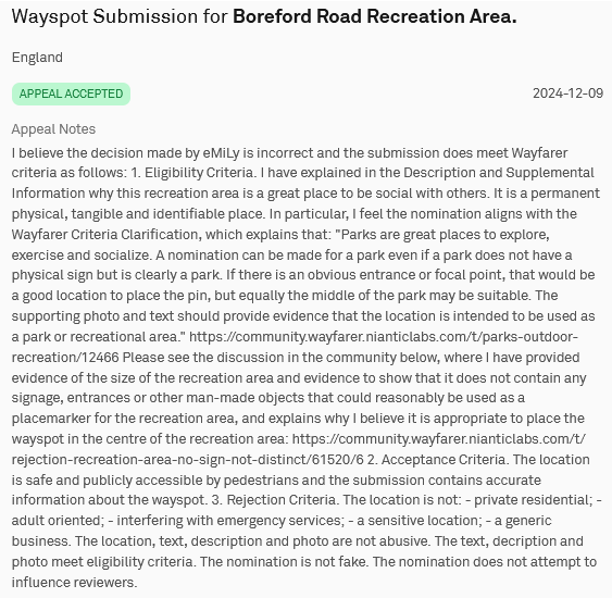 Thanks for the info. I’ve appealed again (I had three nominations that were rejected - the last two were exactly the same apart from the main and supplemental photos being reversed), but this time I have linked to this thread in response to the appeal rejection reasons. Annoyingly, VOWHDC do not acknowledge the existence of this recreation area on their website although their mapping indicates that they clearly maintain it.