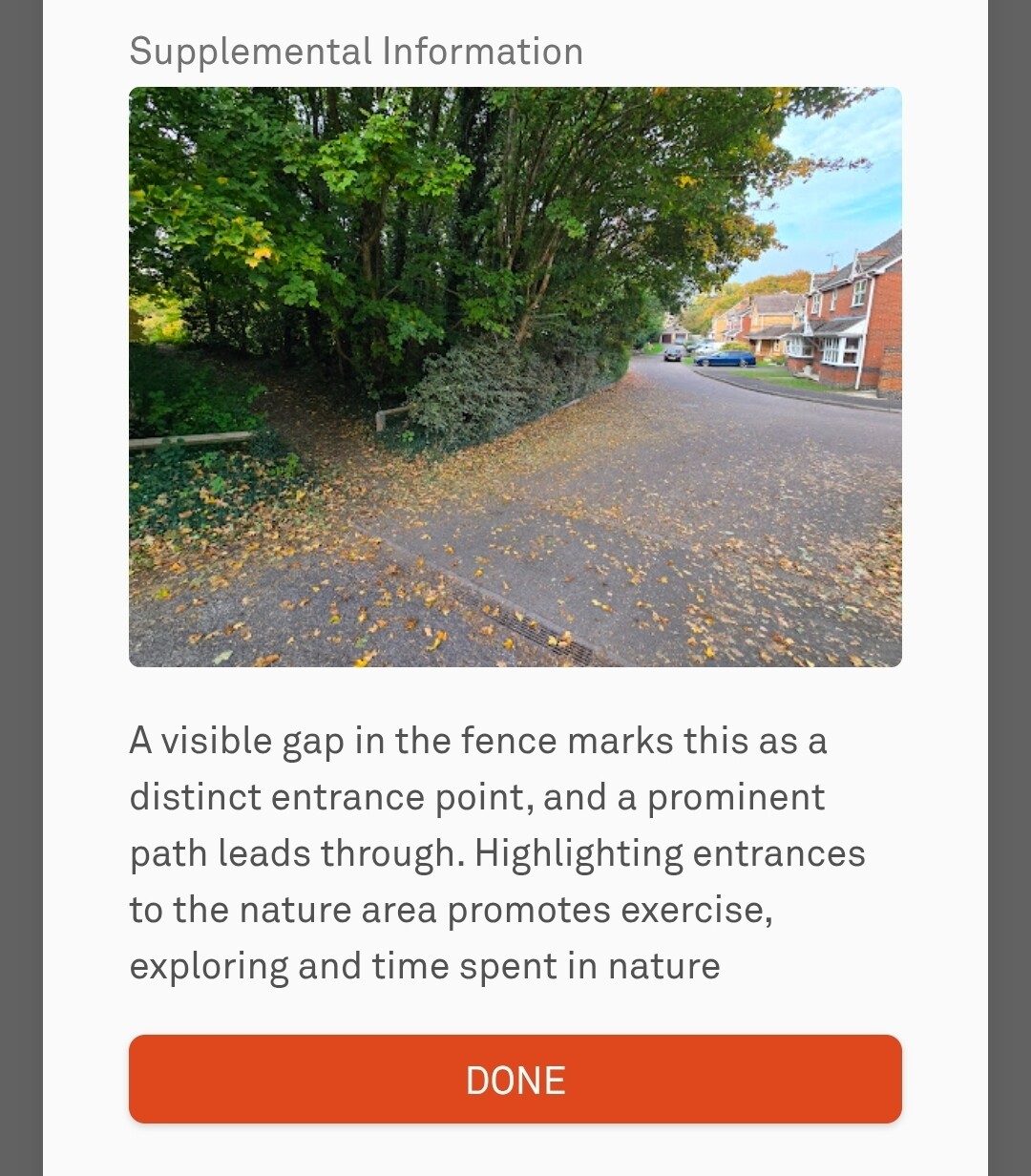 The problem with the above guidance cited by the appeals team is this is an open plan recreation area (3,000+ square metres / 34,000+ square feet), adjoined by footpaths with no boundaries on three sides so no entrance points are required and there are no signs or seating.