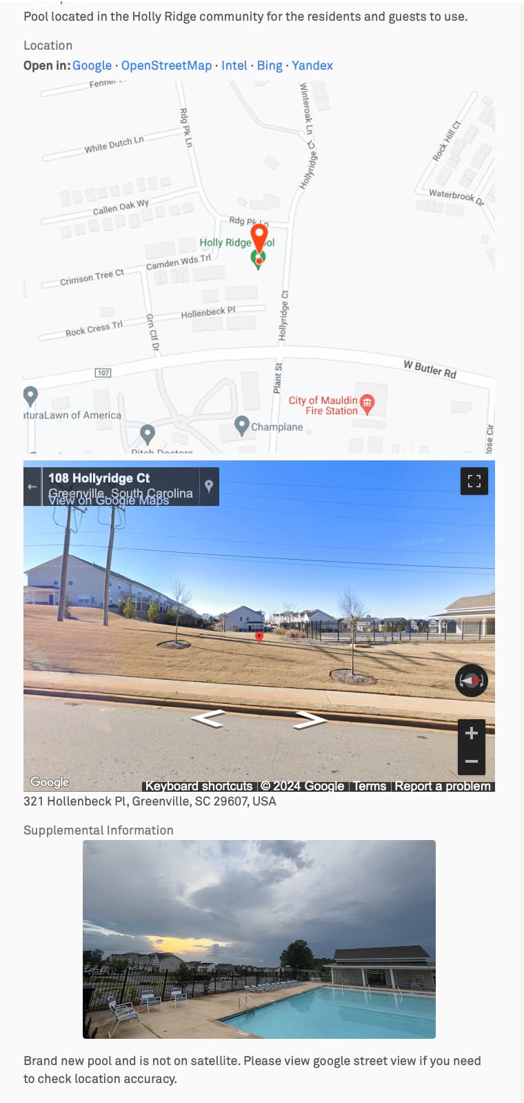 Supporting: Brand new pool and is not on satellite. Please view google street view if you need to check location accuracy.